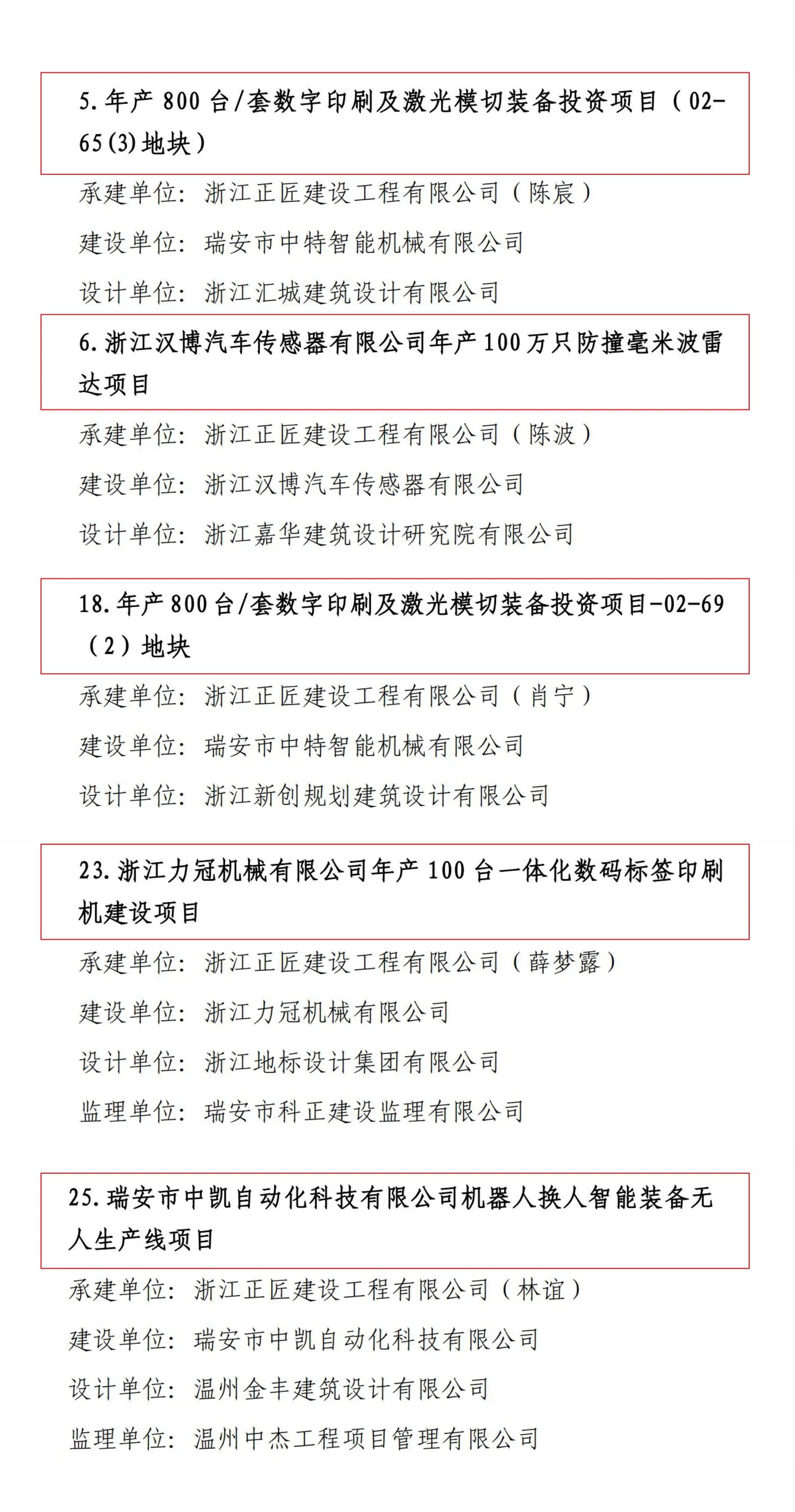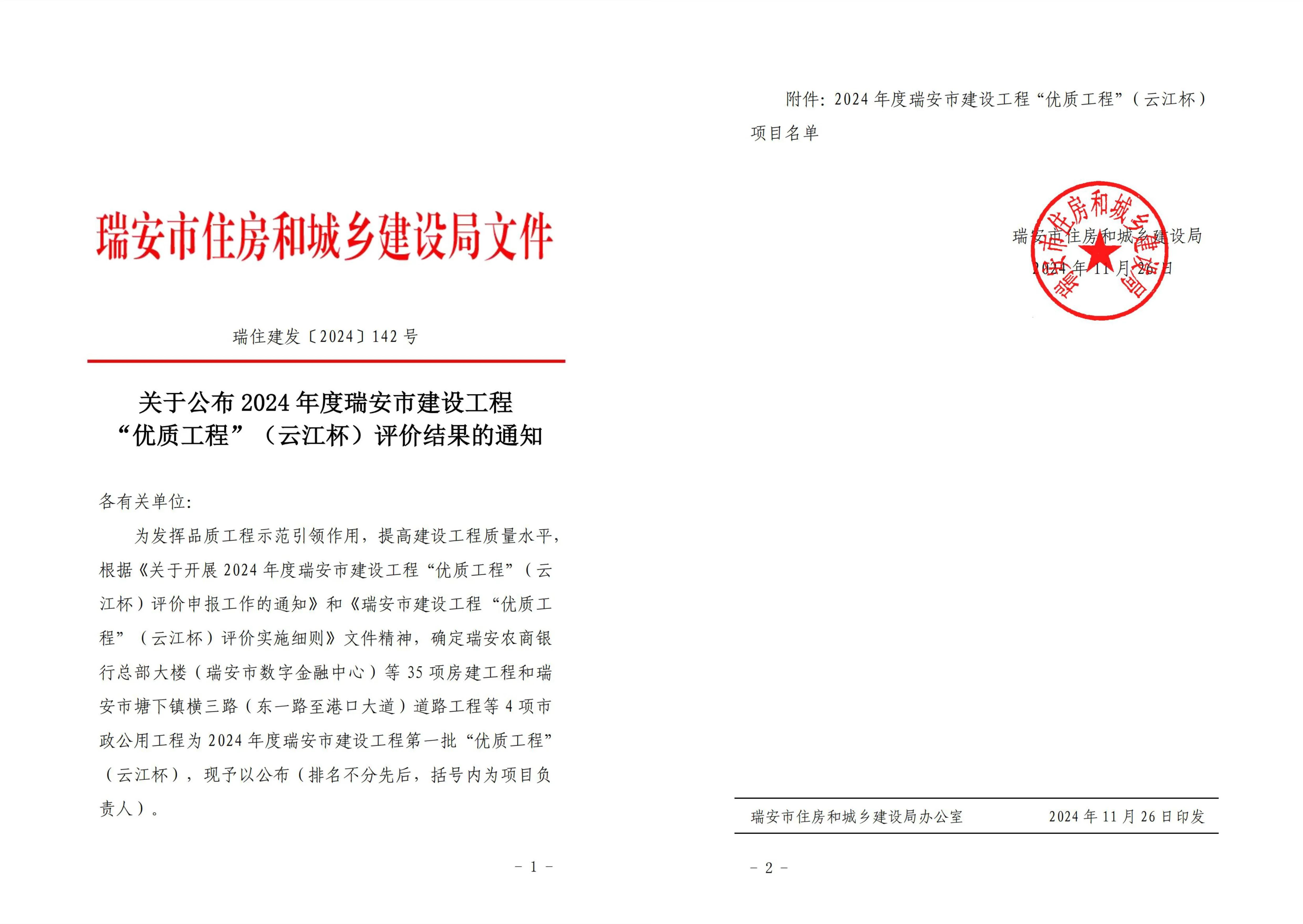 近日,瑞安市住房和城乡建设局发布《关于公布2024年度瑞安市建设工程“优质工程”(云江杯)评价结果的通知》,确定我司汉博、华岳、力冠、中凯、创博五个项目被评为2024年度瑞安市建设工程第一批“优质工程”(云江杯)。