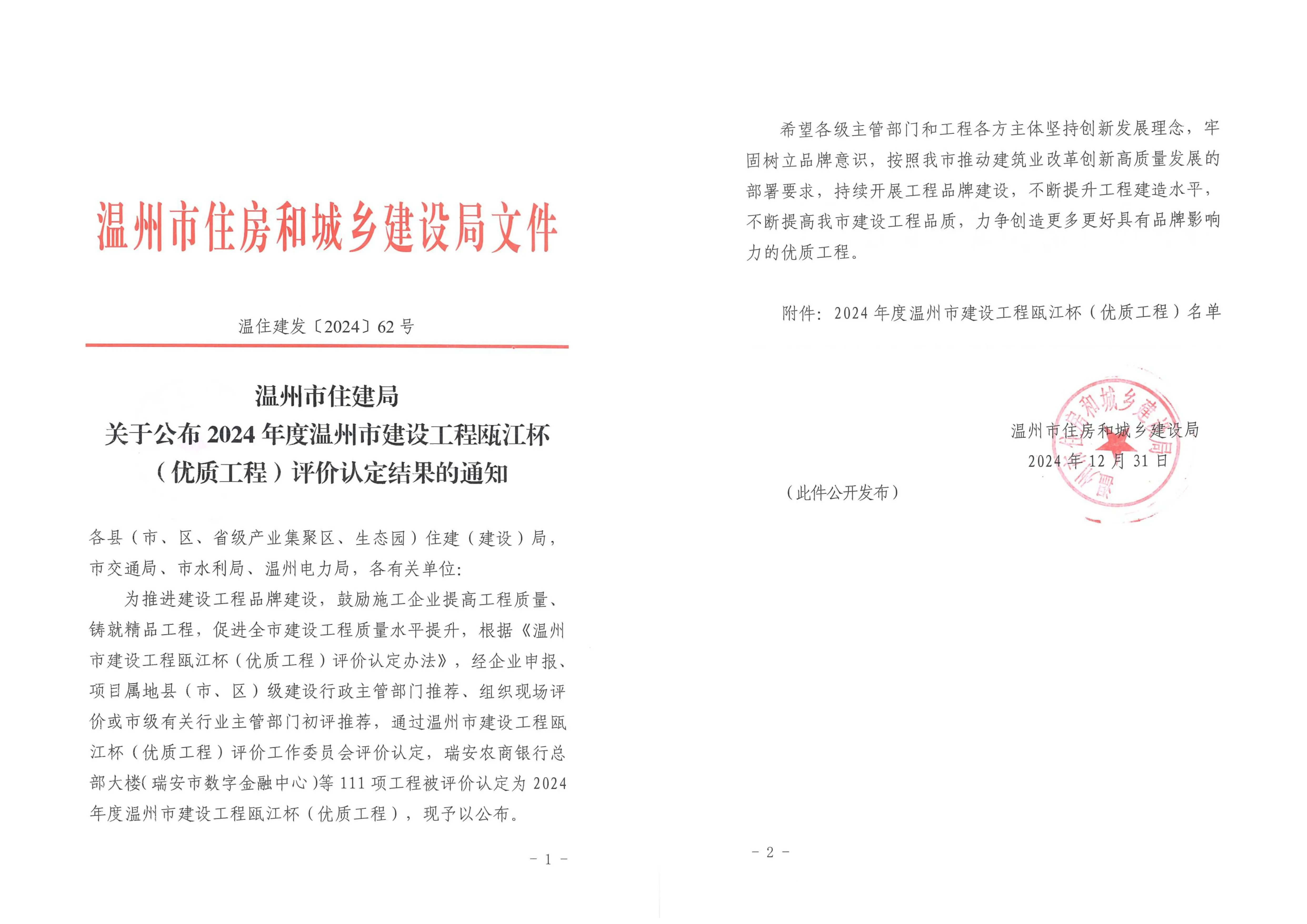 近日,温州市住建局发布《关于公布2024年度温州市建设工程瓯江杯 (优质工程)评价认定结果的通知》,我司华岳项目被评价认定为2024年度温州市建设工程瓯江杯(优质工程)。