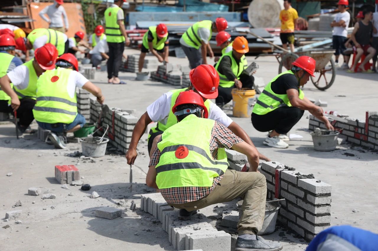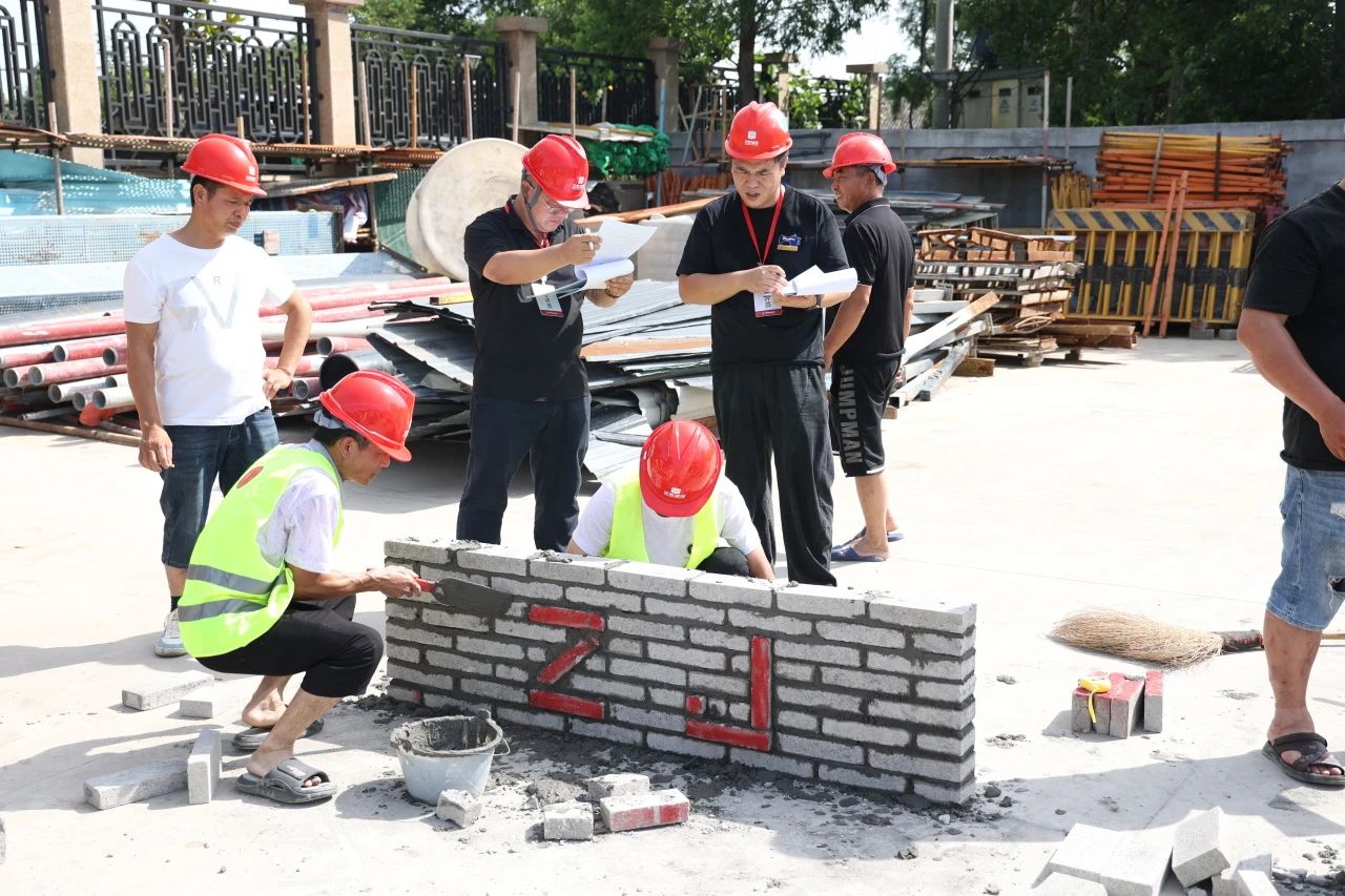 实操考场则是另一番热火朝天的景象。学员们首先熟读图纸,检查材料,然后手握工具,全神贯注地投入到砌筑工作中。考核为2人一组进行协同工作,在规定的时间内完成砌筑,从摆砖到砌筑,每一道工序都一丝不苟。砖墙横平竖直,砂浆饱满,中间融入正匠的首字母设计。