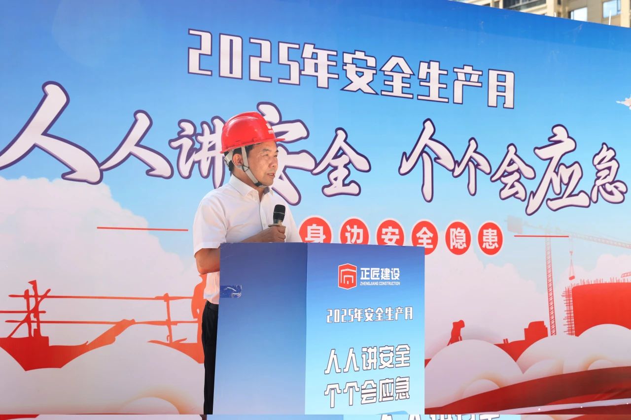 随后,邀请我司董事长 蔡冷双先生为我们作“安全生产月”主题宣贯动员。蔡总强调,安全生产是企业的生命线,必须坚守底线,深刻践行“人民至上、生命至上”的理念。他提出“走深走实、入脑入心、见行见效”十二字方针,要求推动安全理论学习常态化、制度化,让安全理念深入人心并转化为实际行动。蔡总还指出,施工现场隐患排查整治要“全覆盖、真整改、常抓不懈”,建立长效机制,确保风险可控。他呼吁对标先进,深化标准化工地建设,打造“安全文明展览馆”,提升企业核心竞争力和形象。同时,要强化应急能力,开展精准化培训和实战化演练,培育“人人讲安全、个个会应急”的安全文化。蔡总呼吁全体员工以高度的责任感和使命感,将安全责任落实到每个岗位,为公司高质量发展筑牢安全屏障。